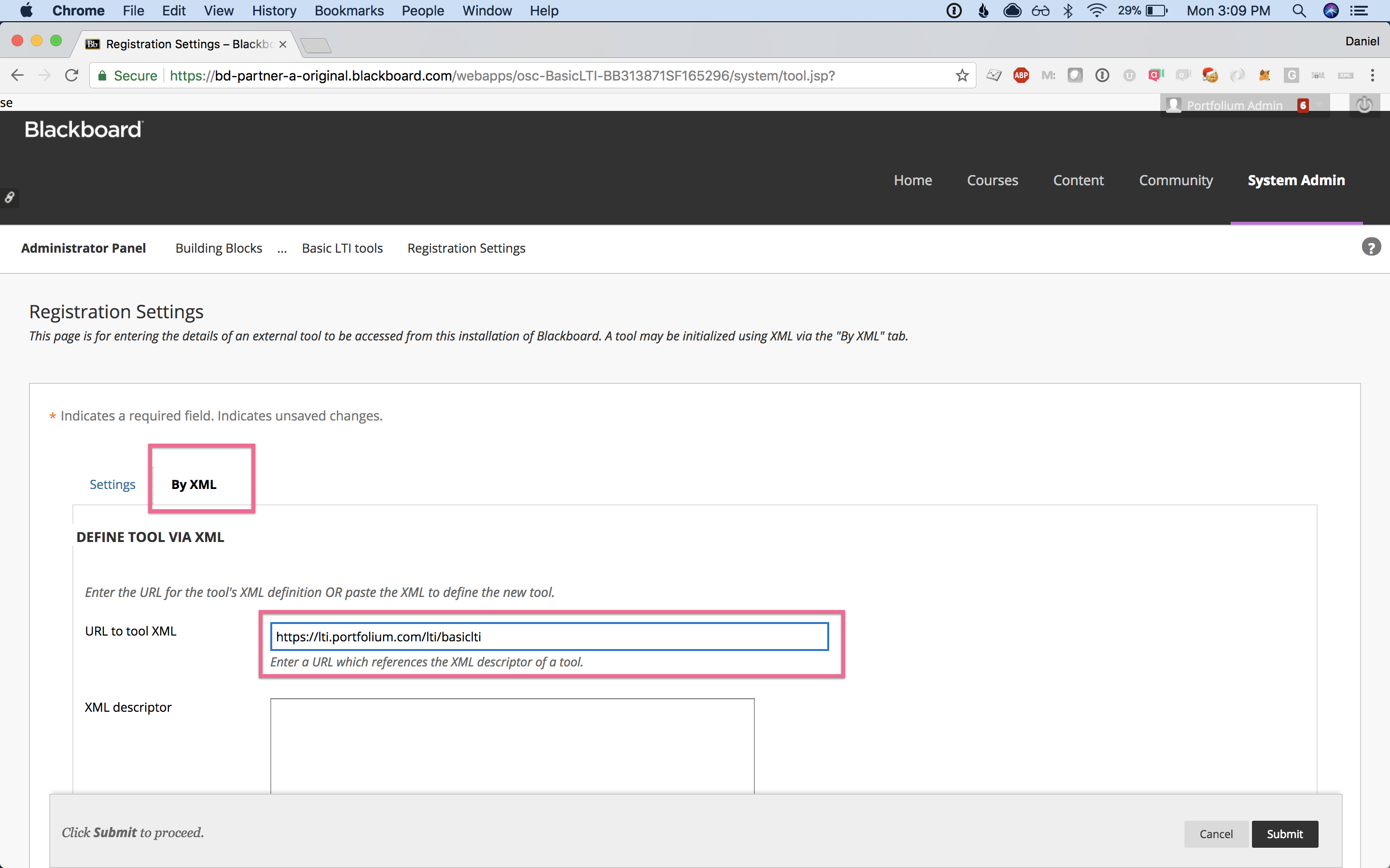 Step 5:Select the "By XML" tab, and use the following URL (leave the XML descriptor empty):https://lti.portfolium.com/lti/basiclti