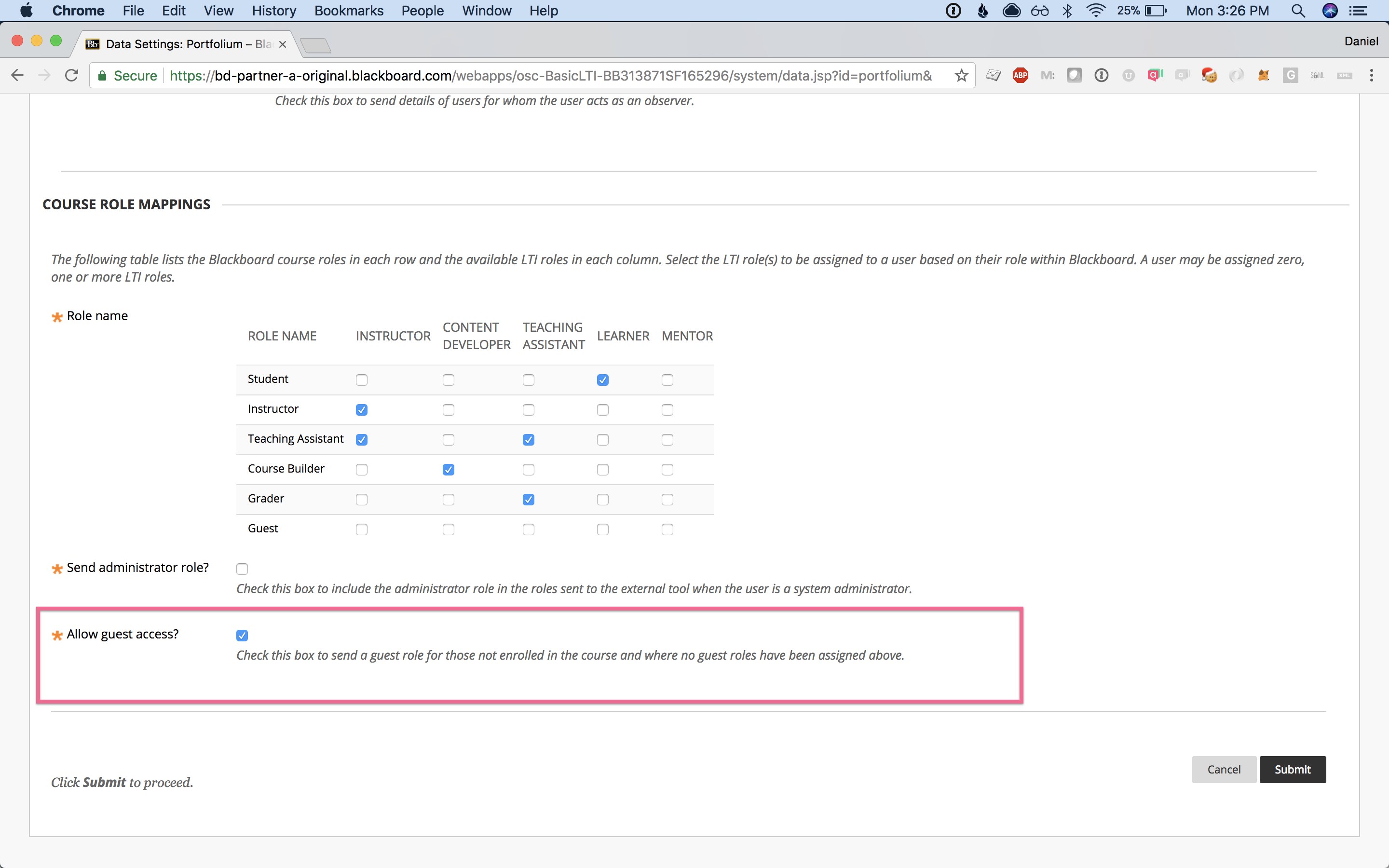 Step 9:Allow guest access in the "Edit registration" settings for the tool. This will allow the Portfolium LTI SSO link to show in the tools block on the homepage for instructors and students.(Hint: the checkbox is at the bottom of the page)