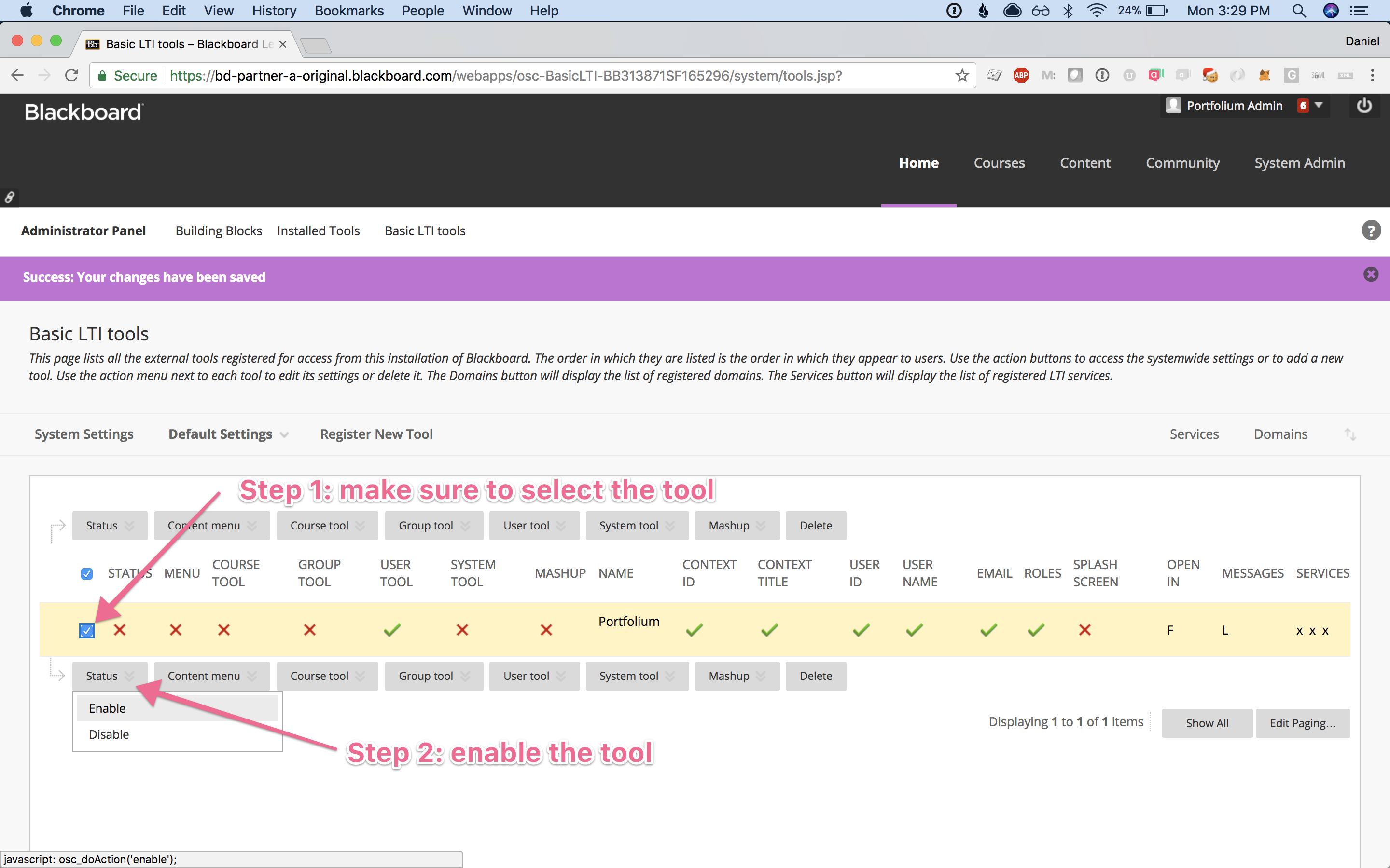 Step 12:Activate the tool by selecting the checkbox next to it, select "Status", then choose "Enable".