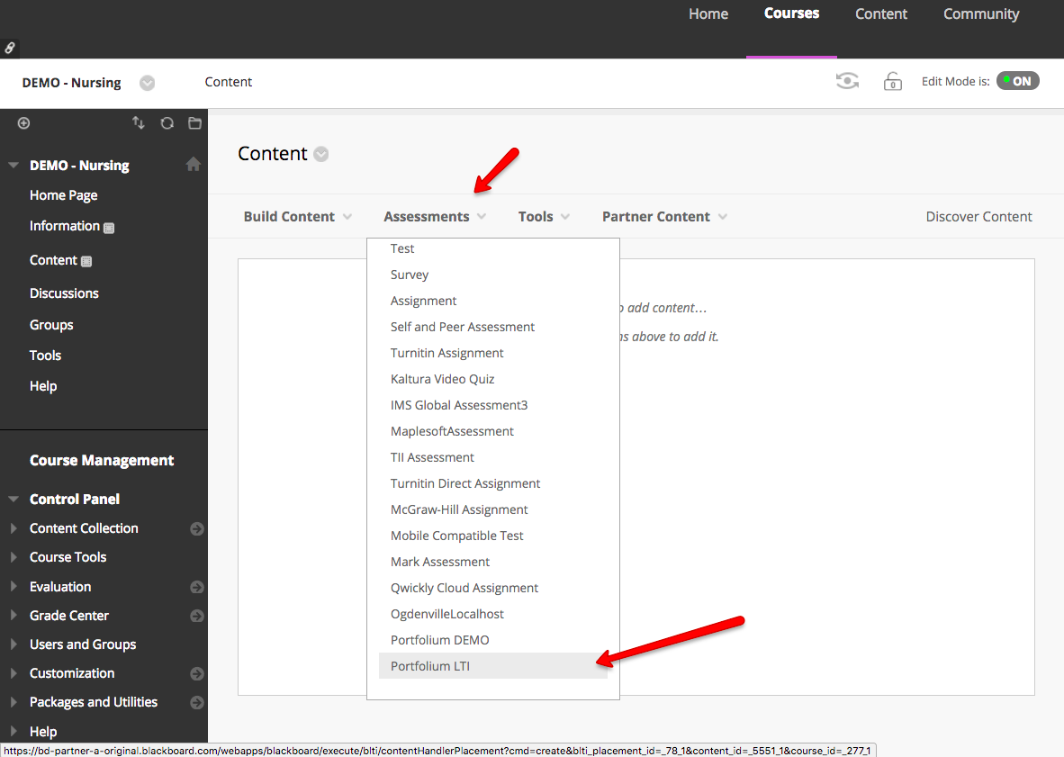 3. Add a new Assignment by clicking on the “Assessments” menu and click on the Portfolium LTI link.