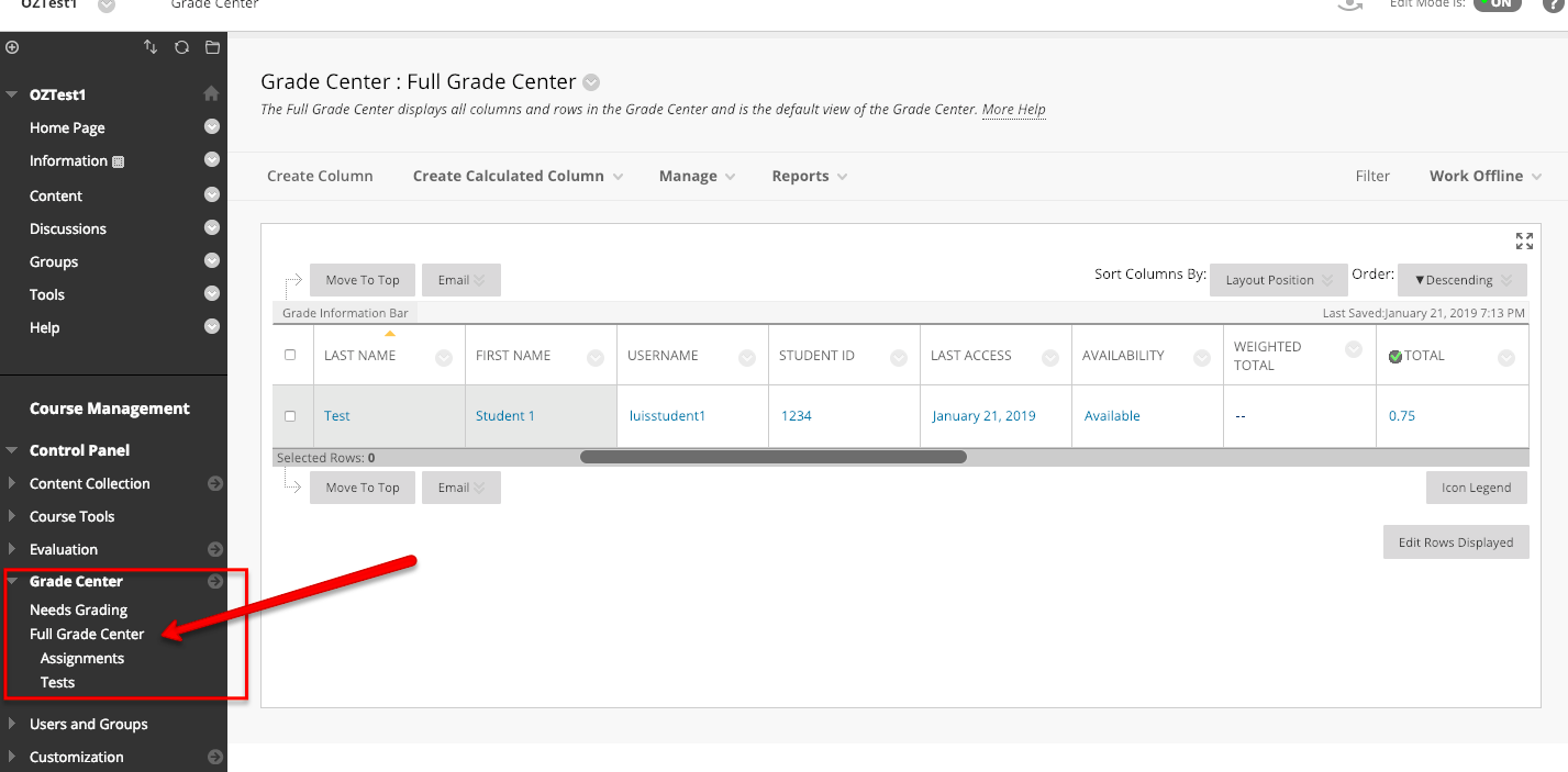 2. Click on the “Grade Center : Full Grade Center” menu.