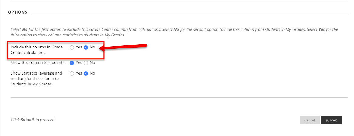 4. In the "Edit Column view", scroll down to the "Options" section and click on the NO radio button for the "Include this column in Grade Center calculations" option.