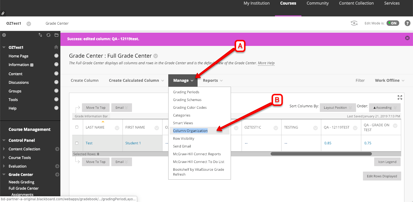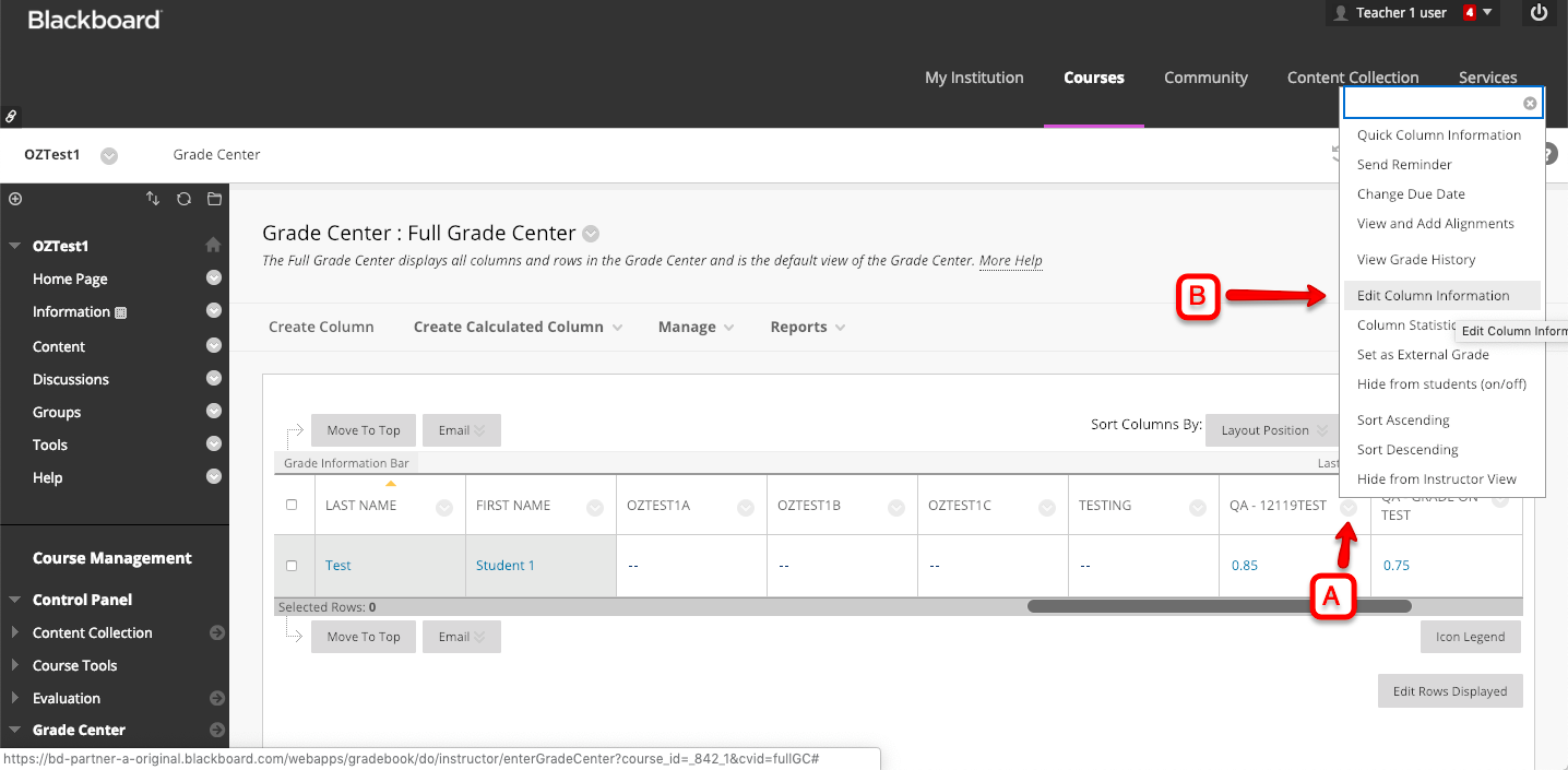 3. Find assignment and click on the chevron [A] next to the grading column and select edit column information [B].