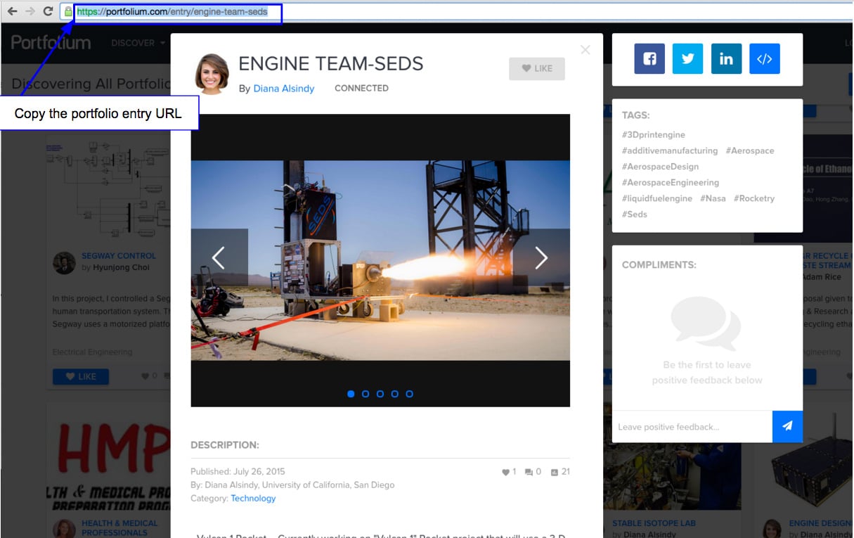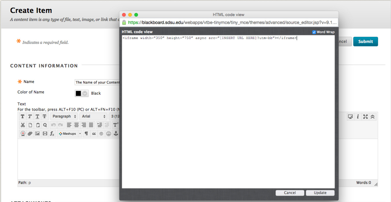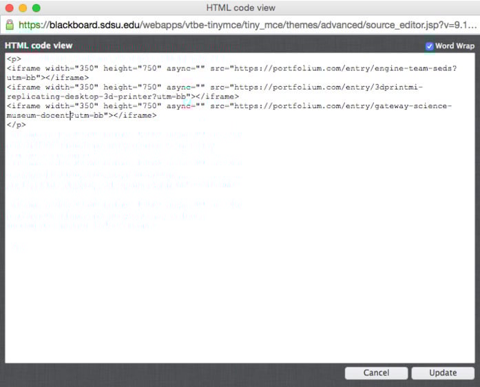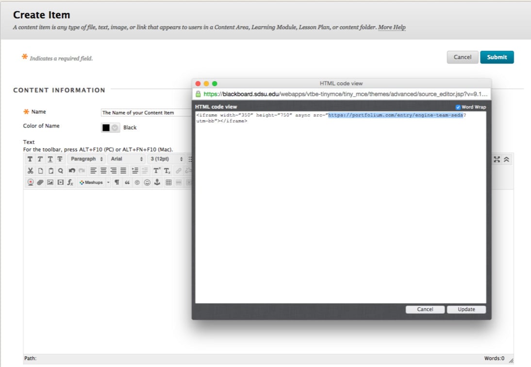 Copy the portfolio entry URL from portfolium and paste into the HTML window, replacing where it says "[INSERT URL HERE]" (including the brackets). Then click "Update", then click "Submit".