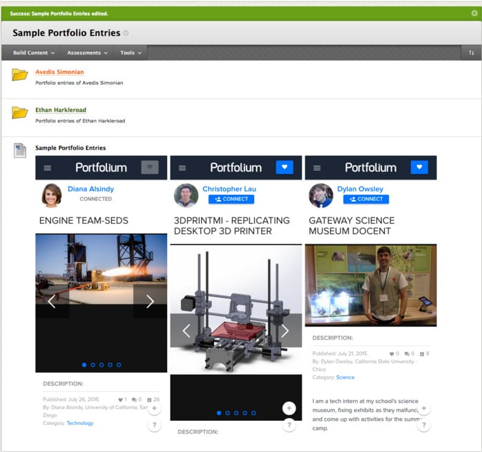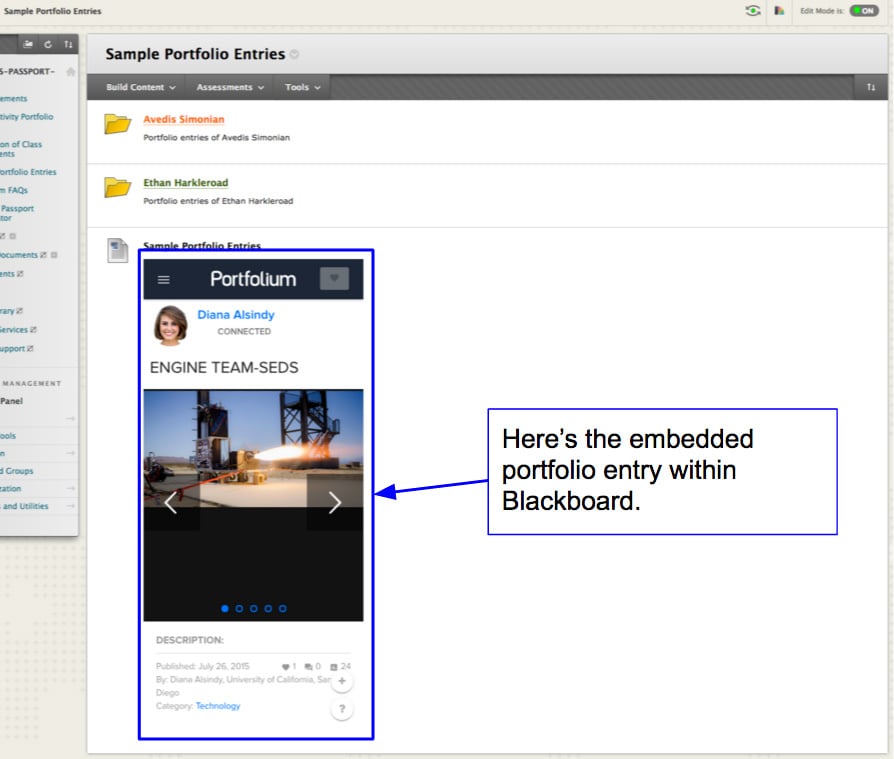 Now the portfolio entry from Portfolium is embedded onto the Blackboard class module: