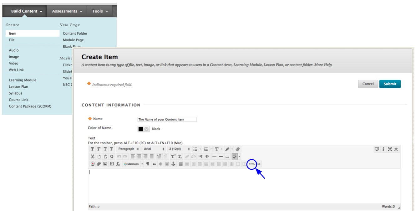 Inside of your Blackboard class module, create a new Item under Build Content.On the Create Item page, click the "HTML" button.