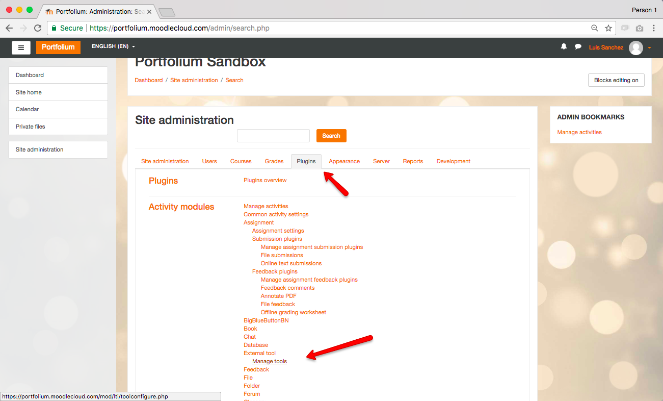 3. On the Site administration section, click on the "Plugins" tab and find the "External tool" > "Manage tools" link