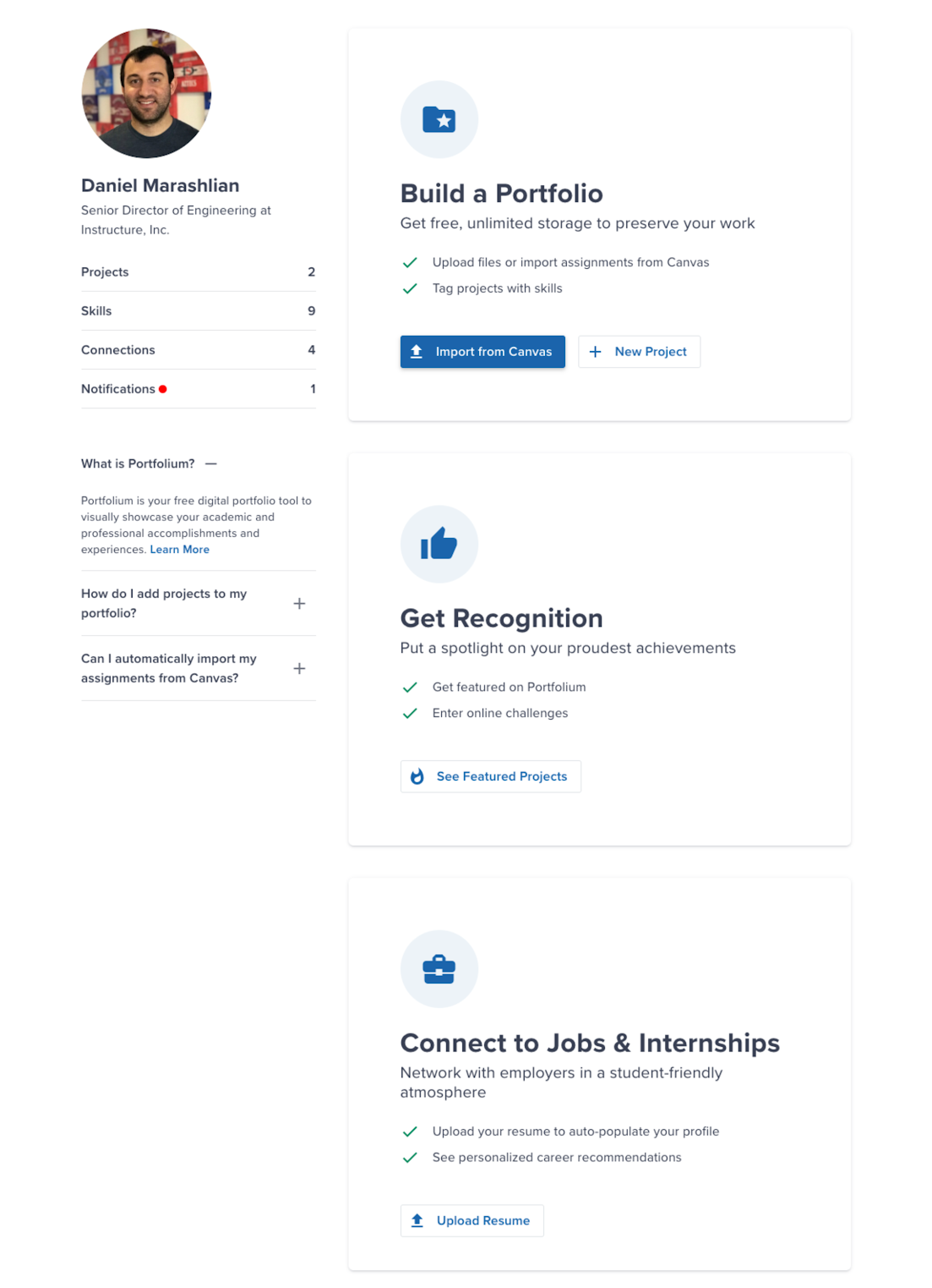 Students are given a clear call to action which allows them toAdd a Project, Update Profile or view Activity Feed. Once a student selects one of the options they will be automatically logged into their Portfolium account.