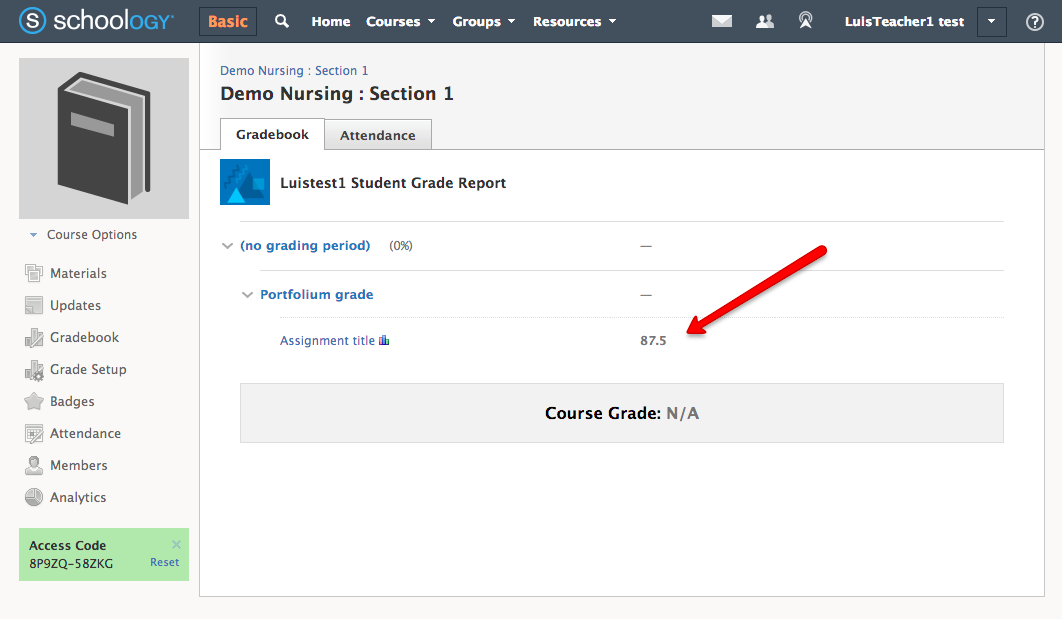 Within Schoology, the feedback and scoring you provided via Portfolium is pulled directly into the gradebook.