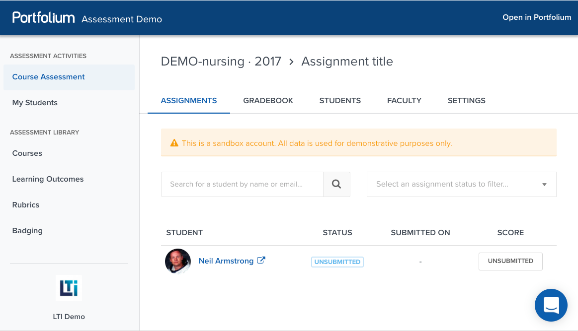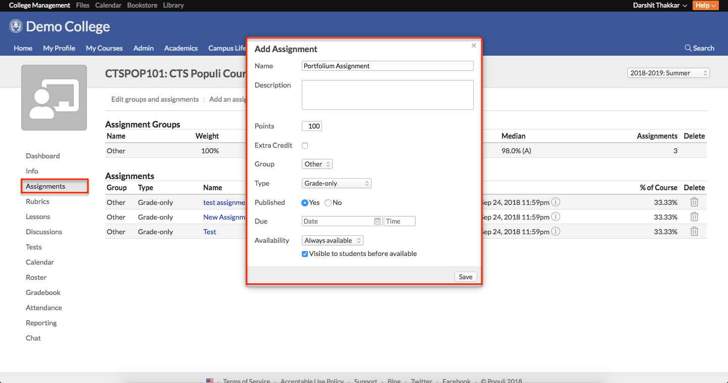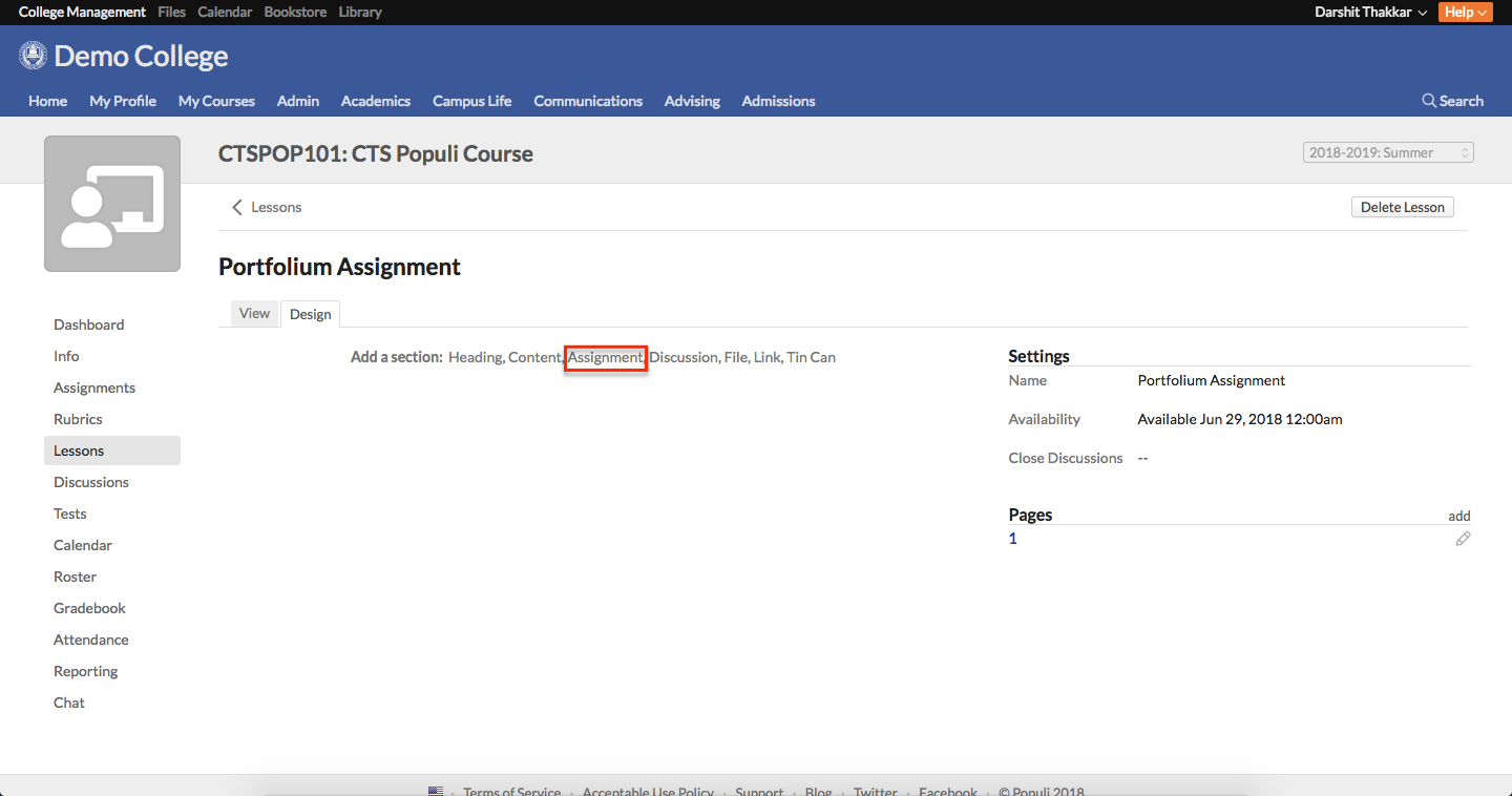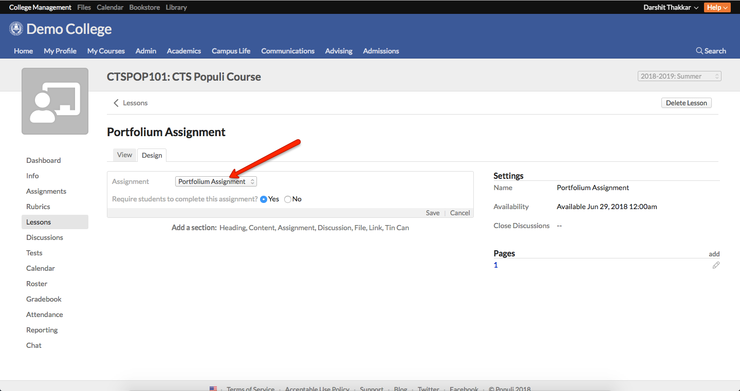 - Within Populi, prior to creating the lesson linked to Portfolium, you will need to create an assignment in Populi's assignments page first, and then make a link in the lesson, and then select that assignment from the assignments list when you're creating the link.