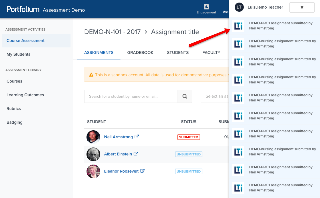 After your students submit their assignments, you will receive an email that alerts you that their assignment is ready to be assessed. There is also a notification that is triggered within the EDU Platform.