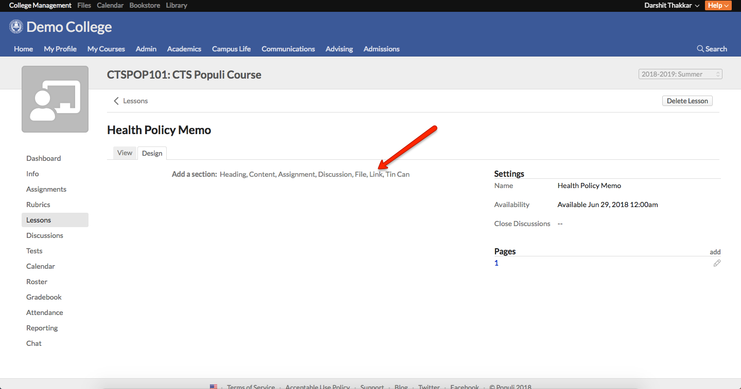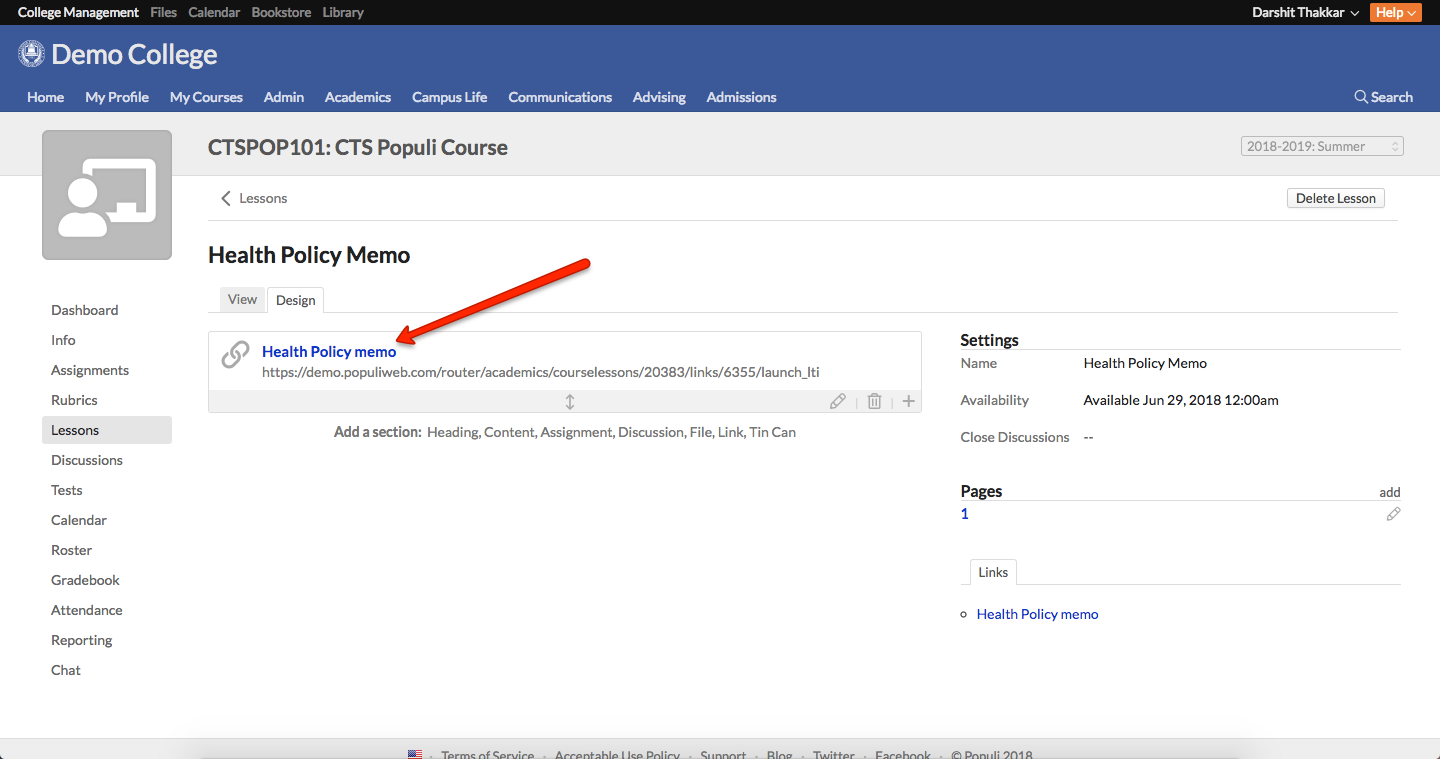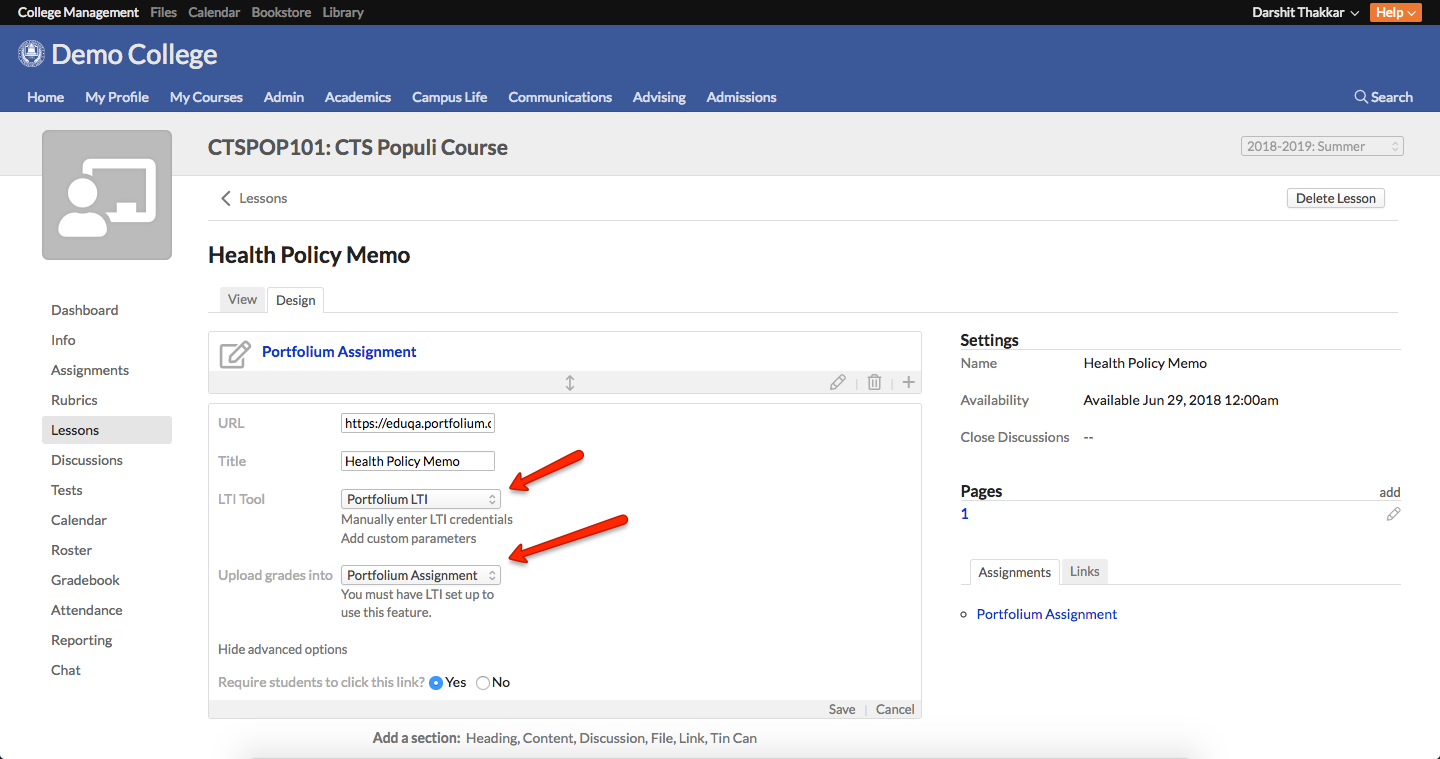 After your LMS admin sets up the Portfolium LTI application, you will then have access to create lessons linked to Portfolium.