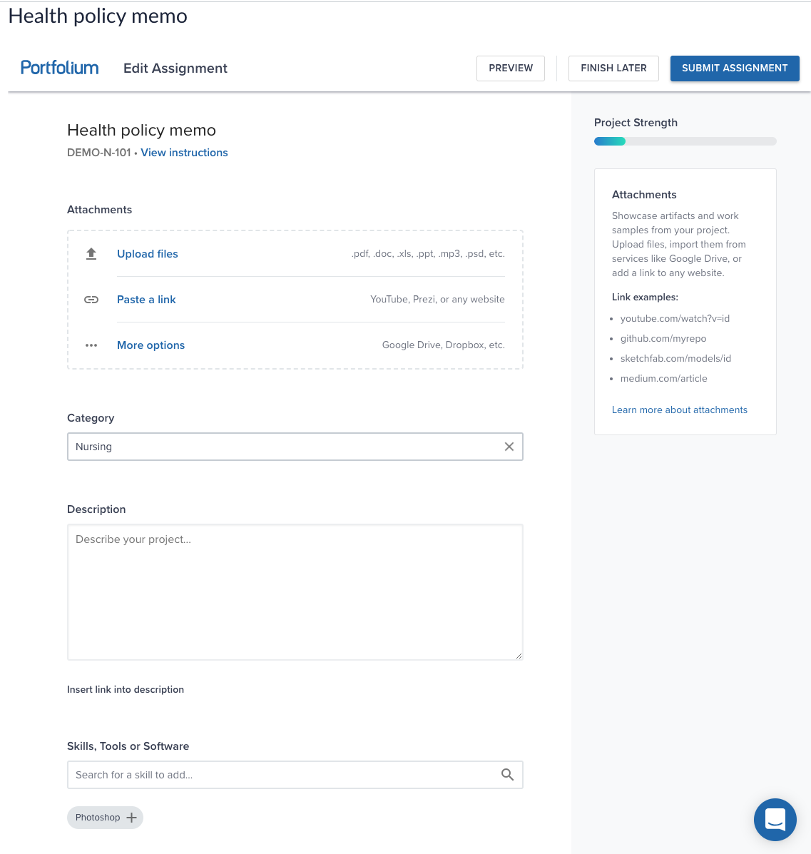 Students are given a clear call to action which allows them to review the details of the assignment, upload supporting documents, check the due date, add more skills and and submit their work.