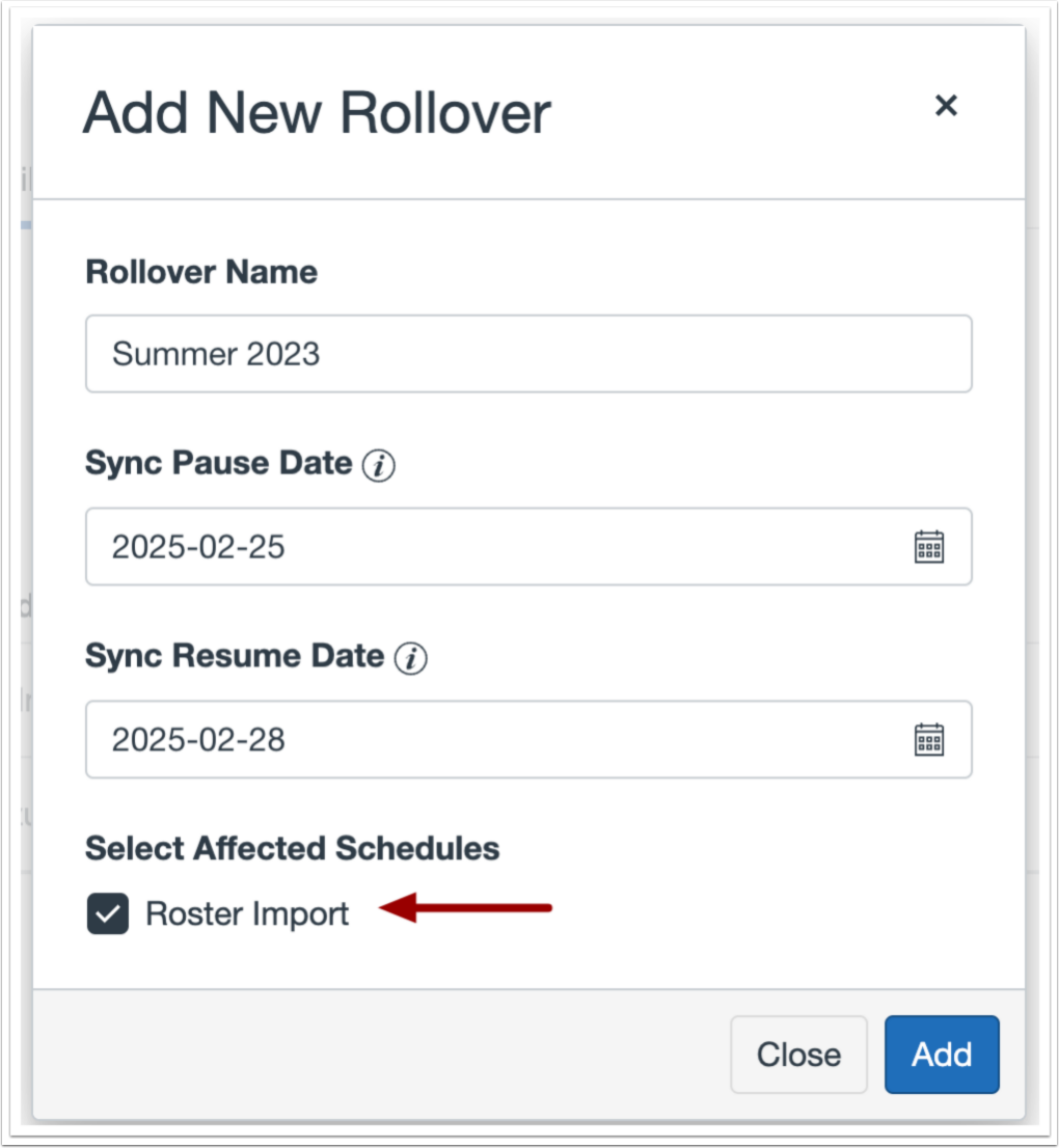 - Please make sure you are setting your Sync Pause Date to be at least 1 day before you roll over to your new school year in Canvas Aeries, and your Sync Resume Date to be at least 1 day after you have completed your rollover in Canvas Aeries. For example, if you are planning to roll over to your new school year in Canvas Aeries from 2024-06-24 to 2024-06-29, you will want to have your Sync Pause Date be 2024-06-23 or earlier, and your Sync Resume Date be 2024-06-30 or later. This is to avoid any unintended data deletions and duplications in Canvas.