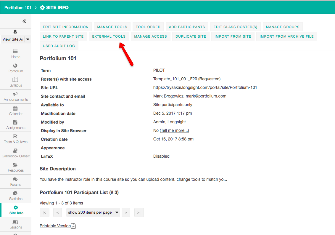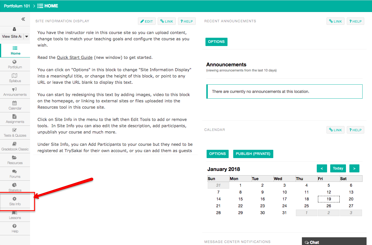 - Logged in as the LMS Admin, on the left navigation, click on “Site info” menu item.