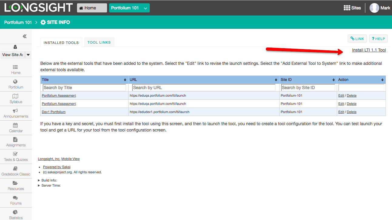 3. On the “External tools” section, click on the “Install LTI 1.1 Tool” link (located on the top right of screen)